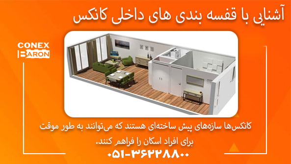 بخشهای مختلفی که در داخل کانکس طراحی میشود تا بتواند رفاه و آسایش را برای افراد درون کانکس مهیا کند به قفسه بندی داخلی معروف است.