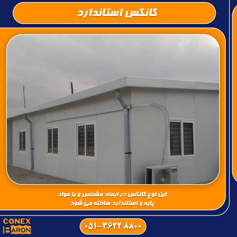 کانکس استاندارد در ابعاد مشخص و با مواد استاندارد ساخته میشود و برای کاربردهای مختلف از جمله اسکان موقت، دفاتر کار و موارد مشابه استفاده میشود. هر چند این ابعاد استاندارد با توجه به نیاز کارفرما امکان تغییر داشته و به صورت سفارشی نیز میتوانید کانکس مورد نیاز خود را از مجموعه کانکس بارون تهیه کنید.
